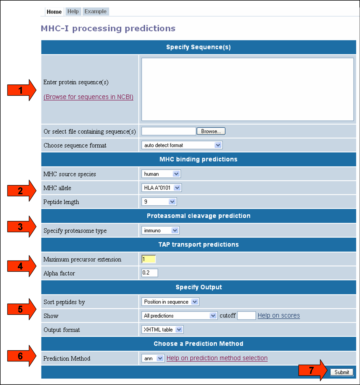 This website provides access to predictions of antigen processing through the MHC class I antigen presentation pathway. The goal of the prediction is to identify MHC-I ligands, i.e. peptides that are naturally processed from their source proteins and presented by MHC class I molecules. The screenshot below illustrates the steps necessary to make a prediction. Each of the steps is described in more detail below.